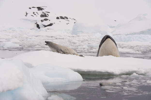 범고래들은 유빙 위의 안전한 곳에서 먹이를 물 속으로 떨어뜨리기 위한